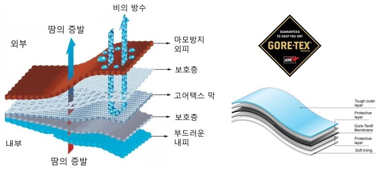 고어텍스(GORE-TEX)는 방수 및 방풍 기능을 갖춘 성능 원단의 상표로, 브랜드라고 이해하시면 편해요. 아웃도어 의류 및 신발, 액세서리 등의 제조에서 널리 사용되는 기술의 이름이자 기능성과 내구성을 제공하는 고급 원단의 이름이기도 합니다. 방수성/방풍성/통기성/가벼움/내구성 이라는 5가지 강점을 가지고 있어요.